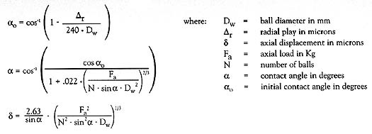 | Once the initial end play has been removed (ball contact angle = ao), then further axial load (preload) will cause axial displacement d at ball contact angle a. Formulae to calculate loaded contact angle a, initial (no load) contact angle ao and axial displacement d under a given preload are as follows: |